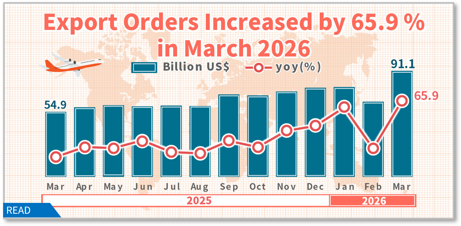 The export orders were US$91.1 billion in March 2026 and increased by 65.9% compared with the same month in 2025. In NT Dollars, the export orders were NT$2,902.6 billion and increased by 60.2% on a year-on-year basis.