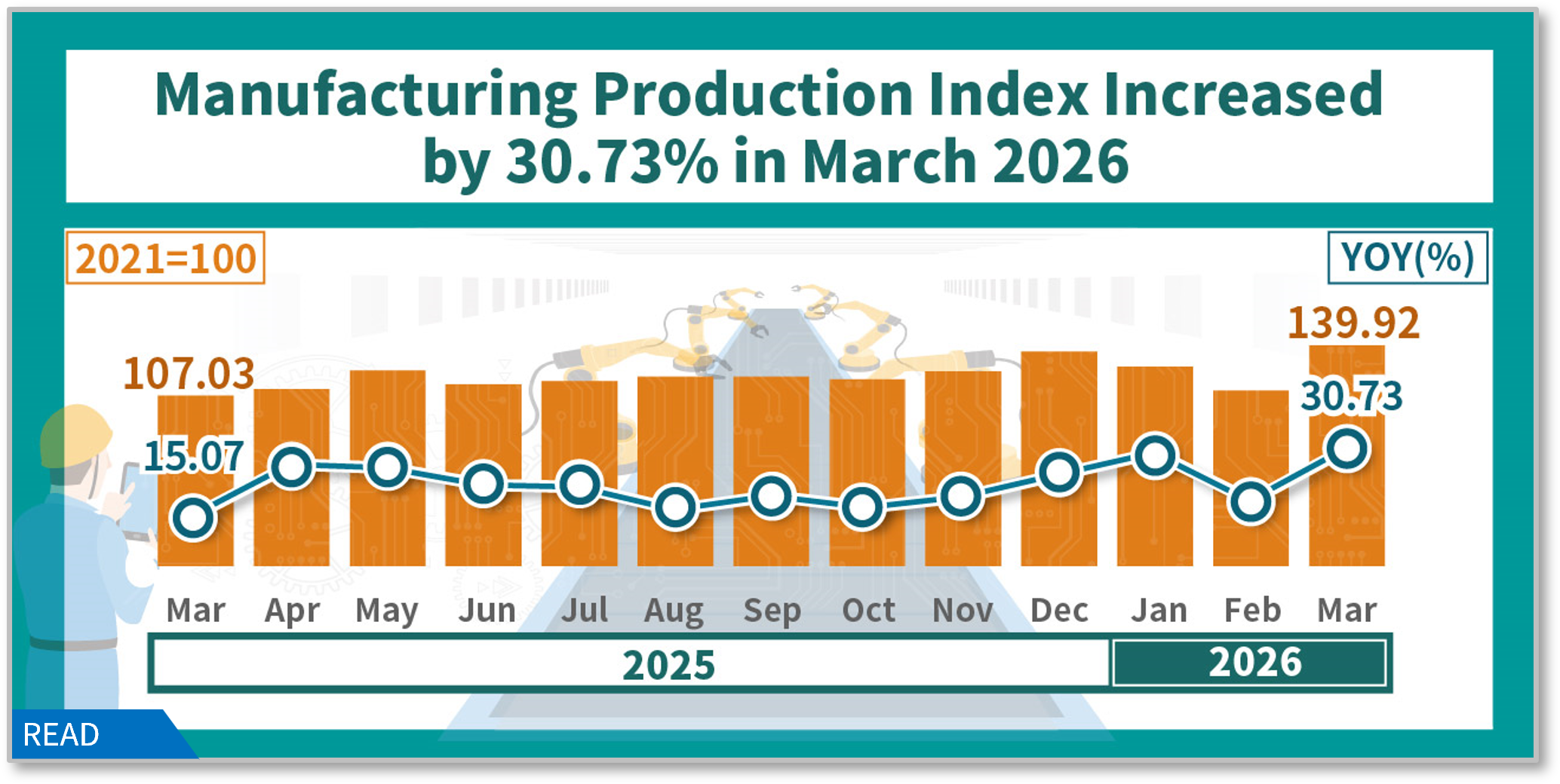 The industrial production index increased by 28.68% in March 2026 compared with the same month in 2025, which included the manufacturing sector increased by 30.73 %, mining and quarrying decreased by 10.65%, electricity and gas supply decreased by 1.77%, and water supply decreased by 0.12%.
