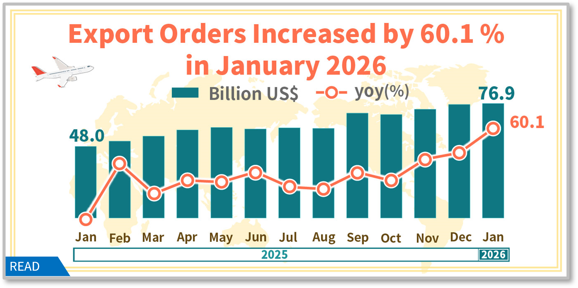 The export orders were US$76.9 billion in January 2026 and increased by 60.1% compared with the same month in 2025. In NT Dollars, the export orders were NT$2,425.7 billion and increased by 53.6% on a year-on-year basis.