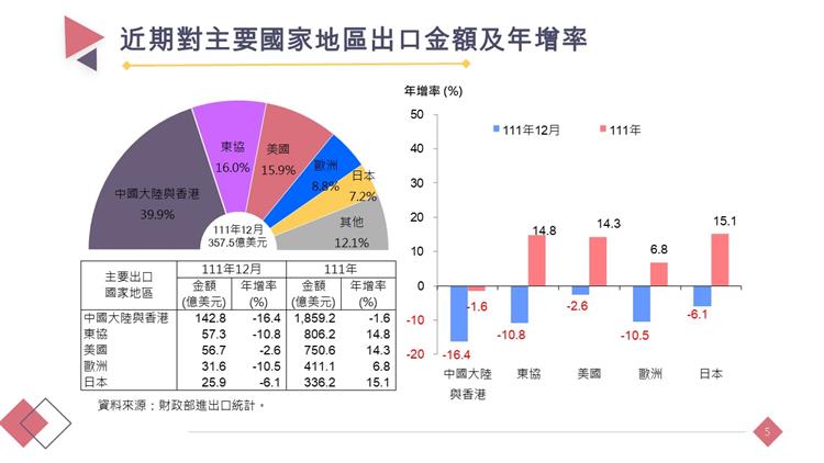 1.出口:12月出口357.5億美元,年增率-12.1%;111年全年出口4,795.2億美元,成長7.4%。