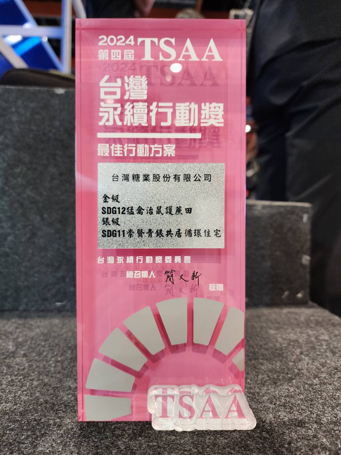 台糖長期耕耘淨零永續,並深化於各項業務之成果有目共睹,今年再以「猛禽治鼠護蔗田」及「崇賢青銀共居循環住宅」勇奪第四屆「TSAA台灣永續行動獎」金、銀雙獎。台糖公司總經理陳立人於今(8)日代表出席頒獎典禮接受表揚,除感謝各界肯定外,也表示台糖未來會持續精進永續經營,並為社會及環境貢獻一己之力。