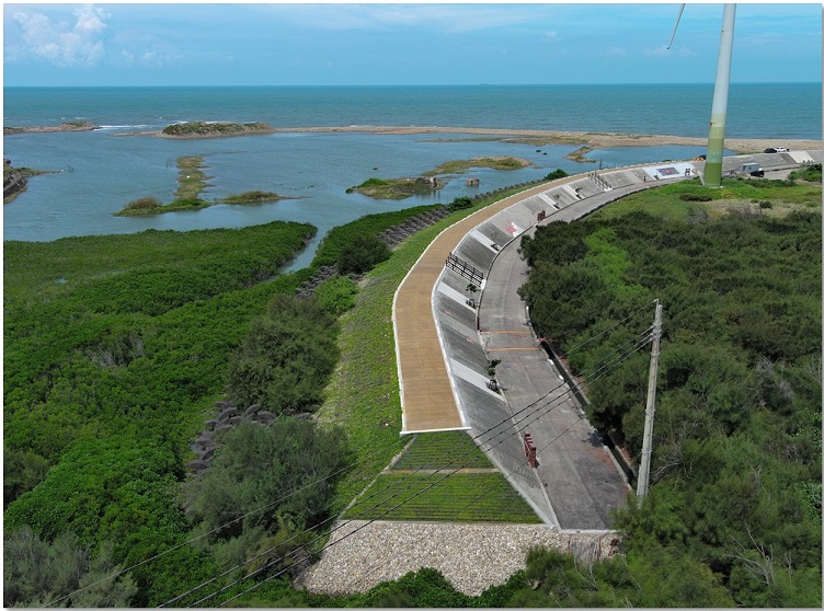 三、房裡海堤整體環境改善工程(一):第二河川分署導入景觀與生態設計理念,友善陸蟹通行兼顧防潮防災,重現苑裡鎮特色風貌融入磚窯、藺草等文化產業元素。