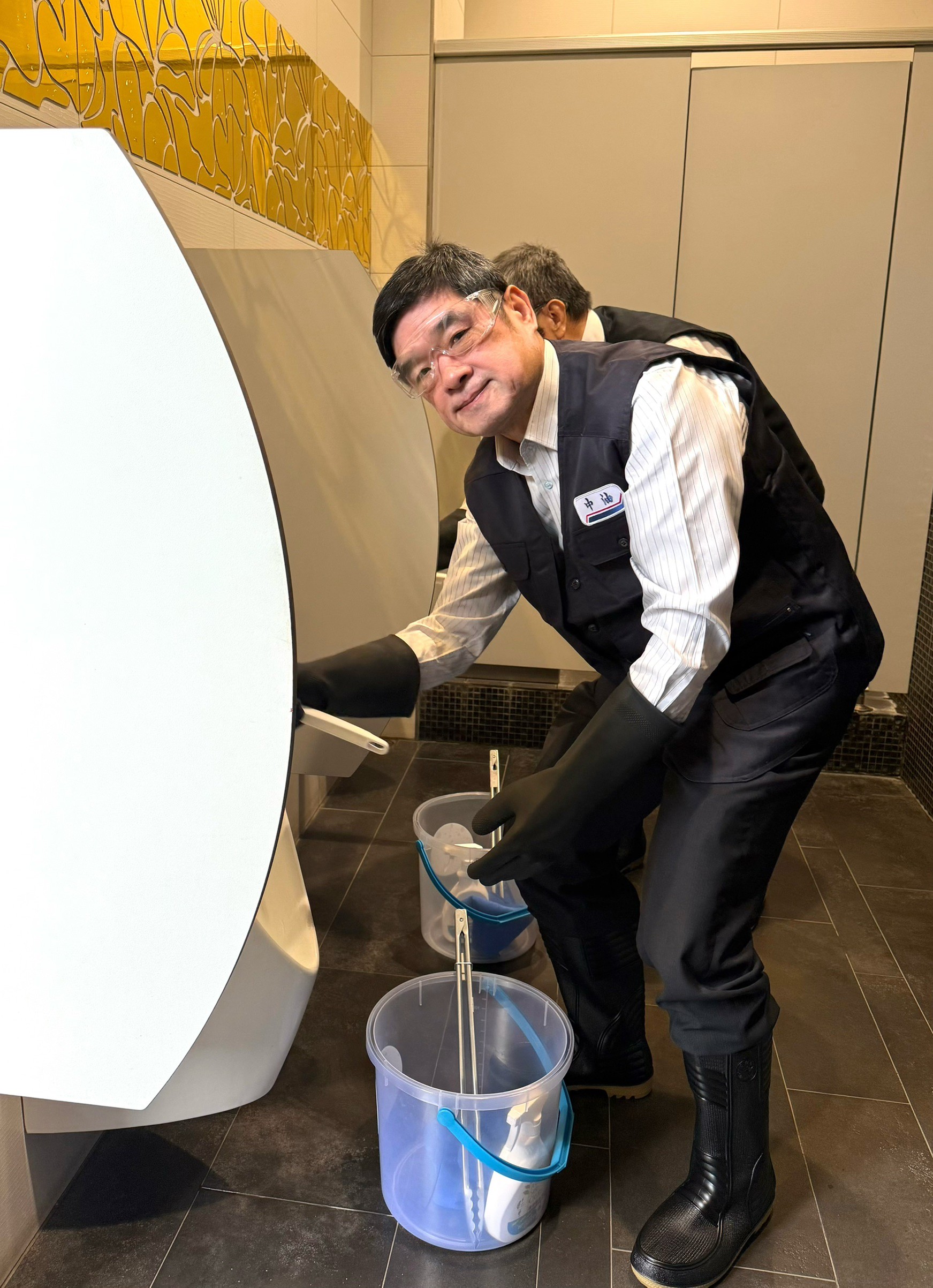 台灣中油副總經理羅博童(中)及貴賓著裝帶頭清洗廁所