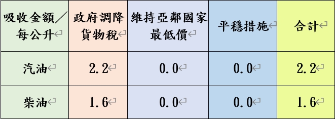 按浮動油價機制調整原則,汽、柴油價格每公升應各不予調整,已低於亞洲鄰近國家(日、韓、港、星)。吸收金額如附表。