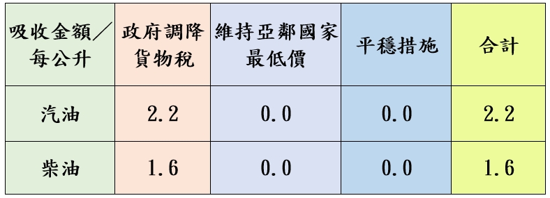 台灣中油表示,本週受石油輸出國組織及夥伴國(OPEC+)維持明年第一季不增產及俄烏和平談判進展陷入停滯等因素影響,導致國際油價上漲。按浮動油價機制調整原則,汽、柴油價格每公升應各調漲0.1元,已低於亞洲鄰近國家(日、韓、港、星)。吸收金額如下表: