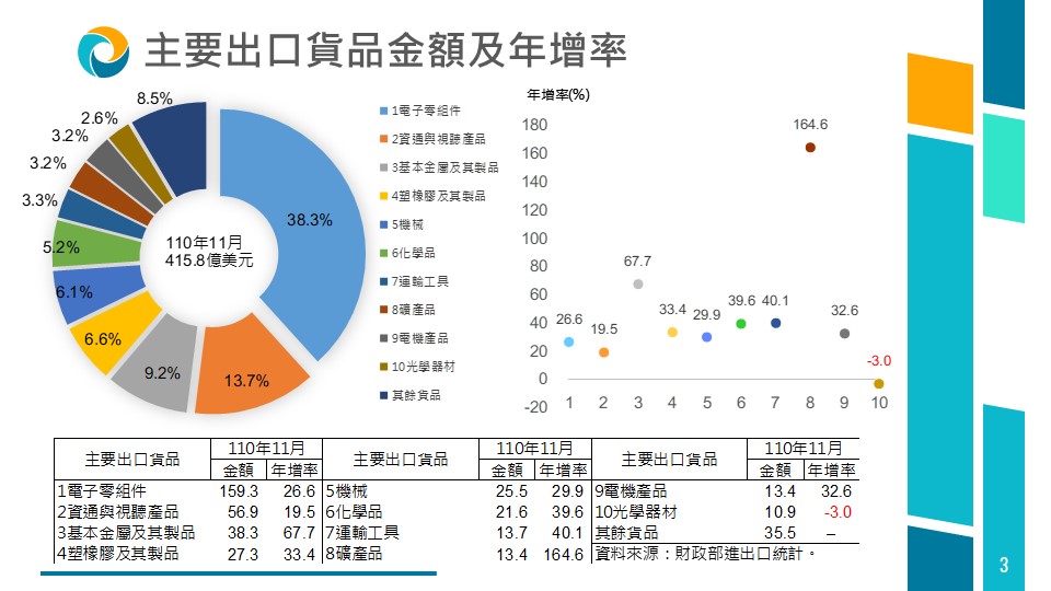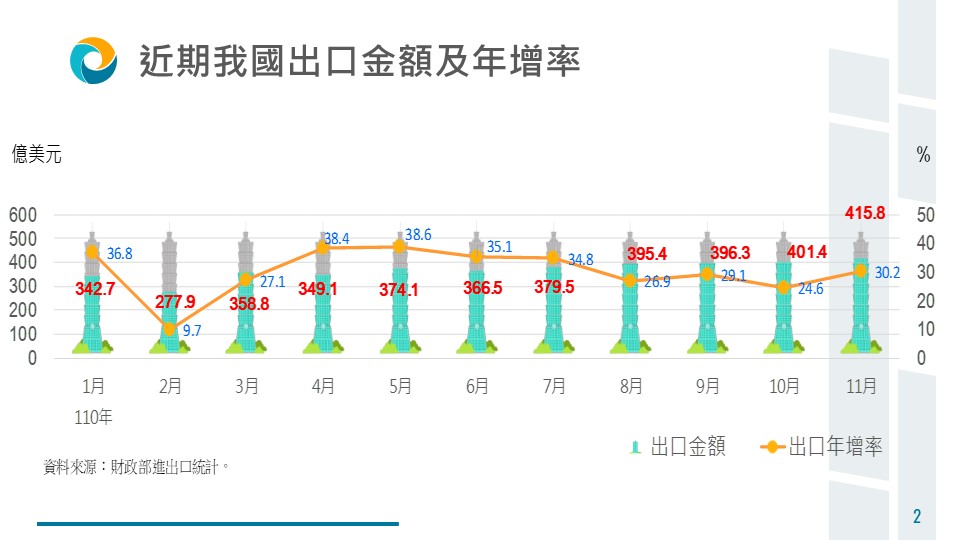 1.出口:11月出口415.8億美元,創歷年單月新高,年增率30.2%;累計1-11月出口4,057.5億美元,超越歷年全年出口額,成長30.0%。