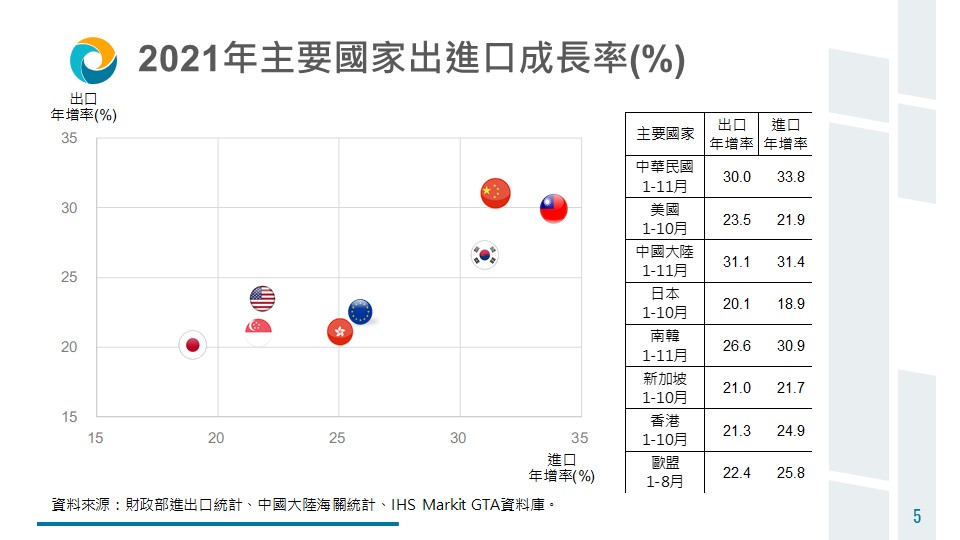 2.進口:我國33.8%(1-11月),優於中國大陸31.4%(1-11月)、南韓30.9%(1-11月)、歐盟25.8%(1-8月)及香港24.9%(1-10月)。