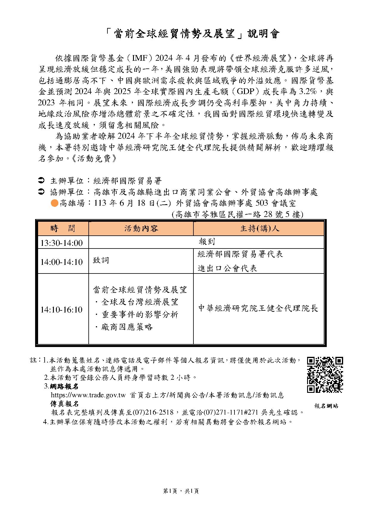 「當前全球經貿情勢及展望」說明會(6/18高雄場)