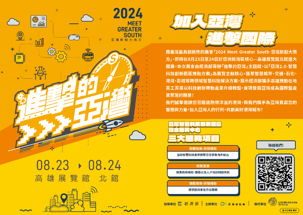 經濟部產業發展署與中小及新創企業署,在8月23日高雄展覽館登場的「2024 Meet Greater South亞灣新創大南方展」活動,聯手籌設主題館,集結了進駐亞灣廊帶的17家企業與新創,展示將5G通訊、AI、物聯網、大數據科技,整合開發臺灣本土5G+AI加值應用解決方案發展成果,重要亮點包括行動AI平台實現城市交通設施戰情管理、整合船、岸、海事大數據之船舶管理平台、石化廠區工安巡檢預警、XR擴增實境虛擬影視內容產製等加值應用淬鍊,當日經濟部何晉滄次長、高雄市陳其邁市長等貴賓蒞臨現場,共同見證經濟部協助亞灣新興科技產業,南北研發、落地對接帶動當地特色產業轉型成果。