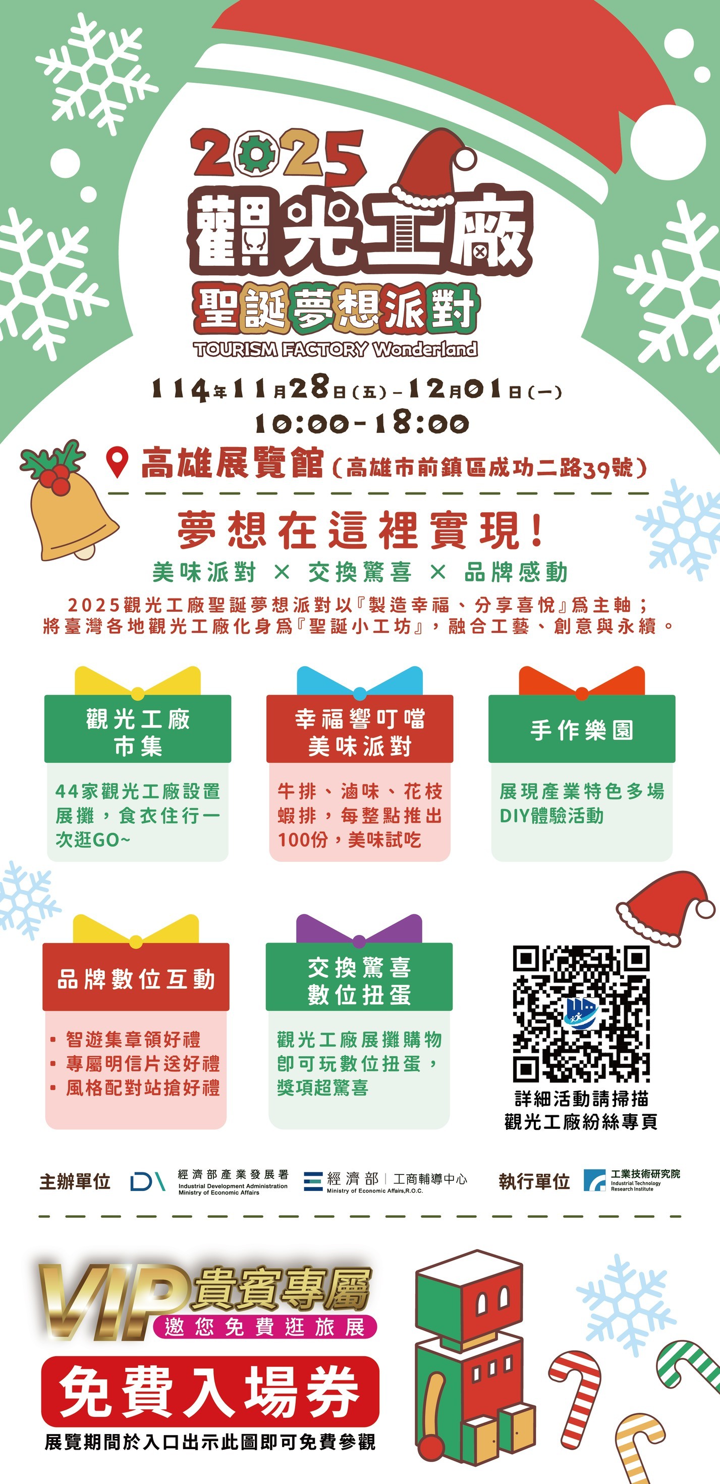 另外本次活動首度移師高雄展覽館,集結44家觀光工廠共同設攤展出,以「觀光工廠聖誕夢想派對」為主題,打造沉浸式數位體驗與歡樂市集氛圍,活動邀請包括以智能製造與職人體驗著稱的太平洋自行車展現工藝與科技、在國際上獲獎無數的妮娜巧克力打造甜點產業的精品級體驗、深耕肉品溯源與熟成工藝的裕賀牛呈現食農教育與肉品科學等觀光工廠共襄盛舉,充分展現臺灣產業的創意與韌性。更多觀光工廠資訊,請至「觀光工廠自在遊」網站查詢:https://taiwanplace21.org.tw。