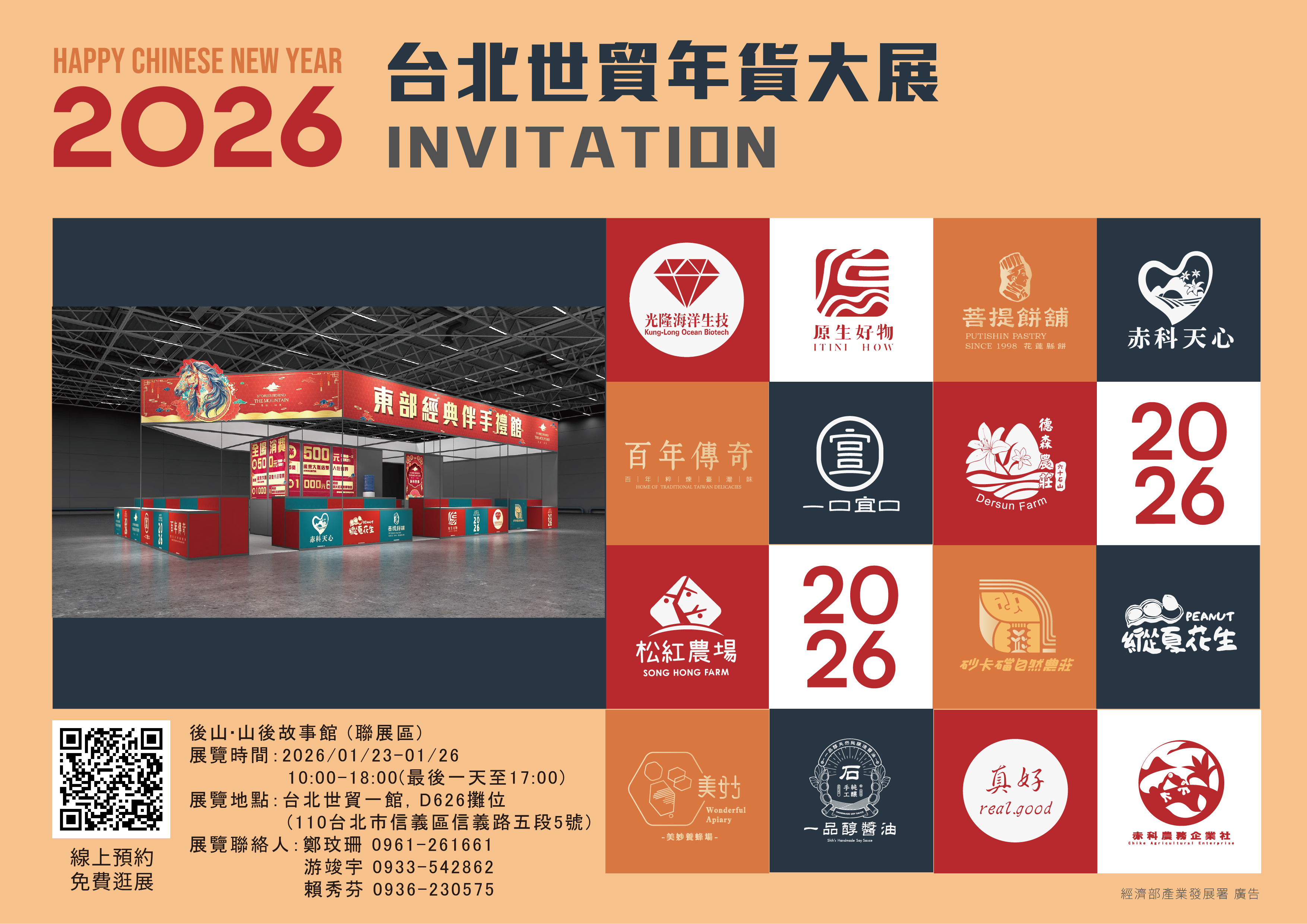 於「2026年世貿年貨大展暨禮品贈品展」辦理東部特色產業禮品與MIT製品推廣活動,藉由展覽推廣與體驗互動活動,提升東部特色產品應用價值與品牌形象。