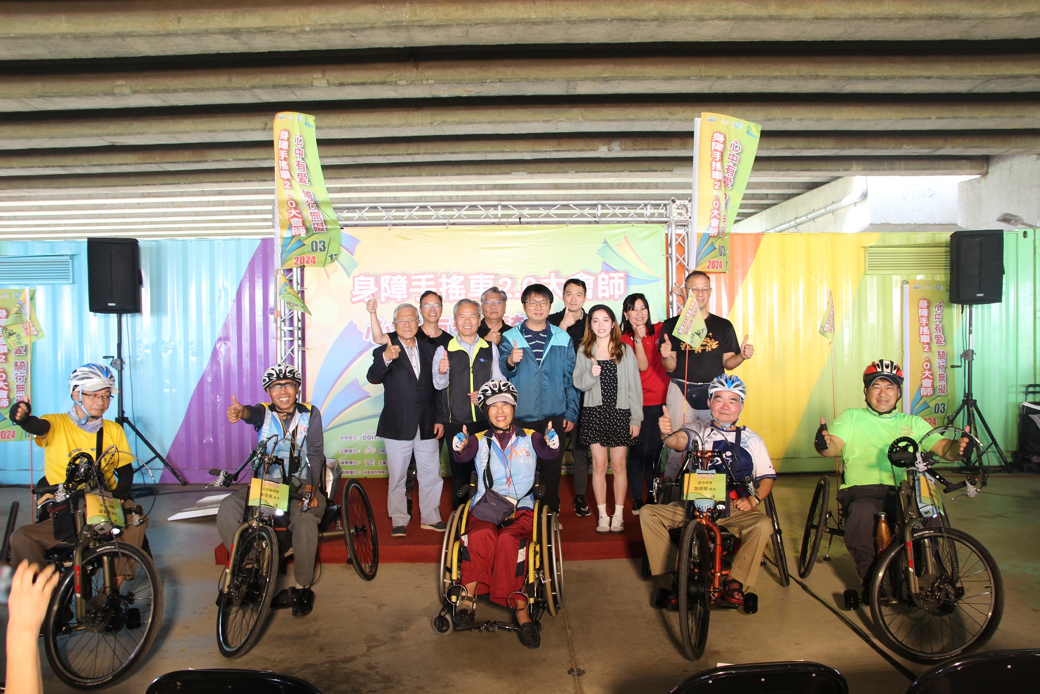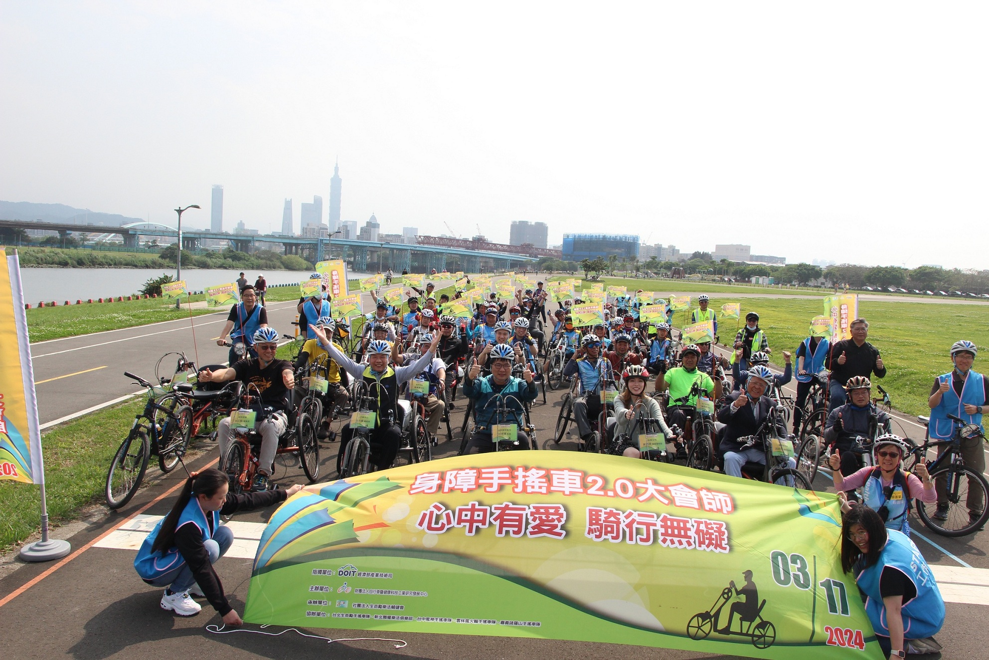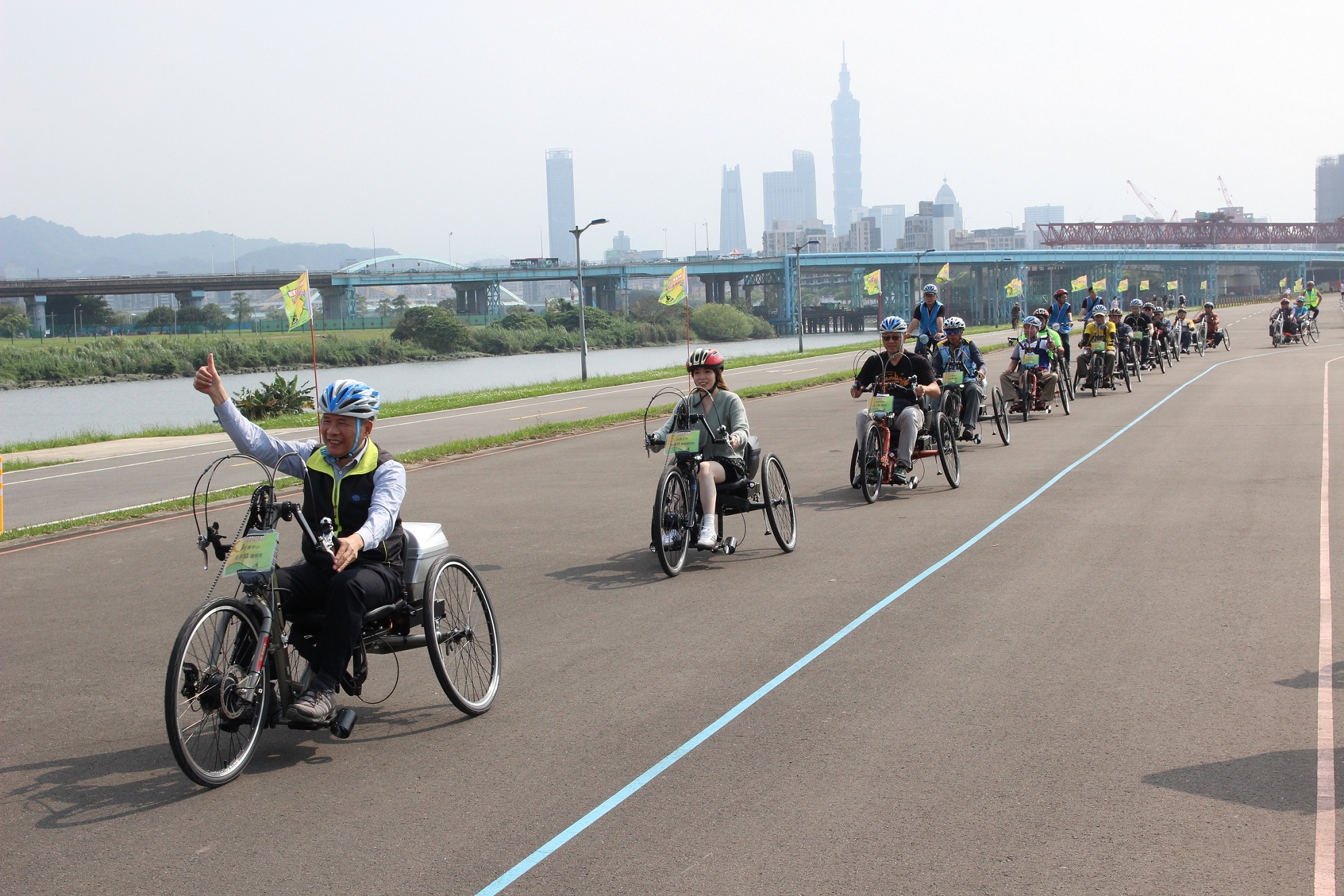 經濟部產業技術司今(17)日舉辦身障手搖車2.0大會師「心中有愛 騎行無礙」,來自全臺5大車隊-生命勵手搖車隊、風火輪手搖車隊、風神手搖車隊、舞擺樂活俱樂部、諸羅山手搖車隊,共計80名身障朋友,於臺北觀山自由車道進行大會師活動,搶先體驗大幅提升各方面功能的身障手搖車2.0,提供身障朋友更安全、健康的運動載具。
