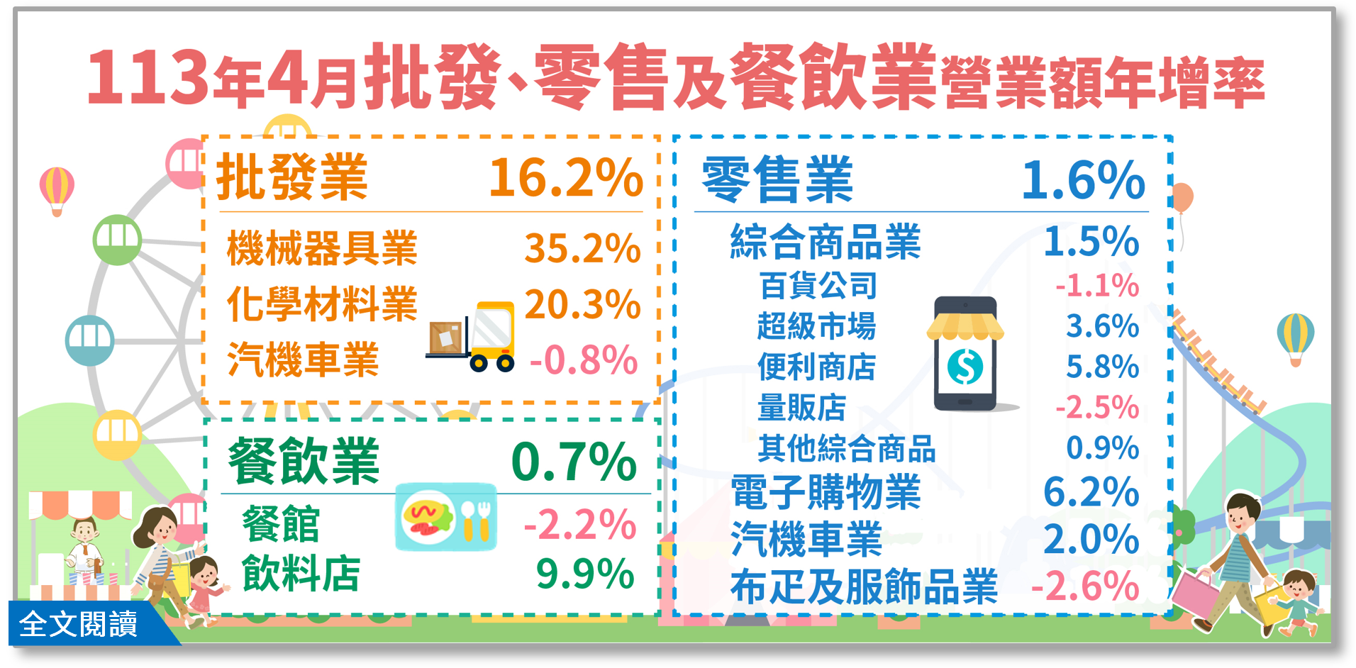 1. 批發業:4月批發業營業額為1兆614億元,年增16.2%,主因AI、高效能運算等新興科技應用需求持續暢旺,以及傳產貨品類外銷增溫,加上國內通路商為應母親節檔期需求,拉高備貨量,致機械器具批發業年增35.2%、化學材料批發業年增20.3%、食品、飲料及菸草批發業年增4.5%、藥品及化粧品批發業年增7.5%;汽機車批發業則因進口車到港數量減少,略減0.8%。綜計1至4月營業額為4兆1,048億元,年增9.5%。