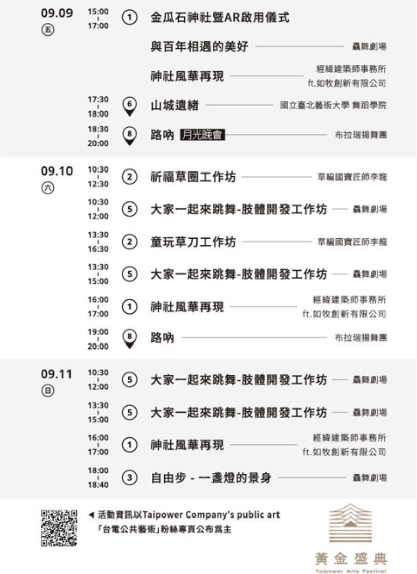 台電搭配百年神社重生,中秋連假推出「黃金盛典藝術祭」,除今日啟用活動,10、11日仍有驫舞劇場、布拉瑞揚舞團精彩表演及神社導覽與工作坊可參與。台電也提醒,活動適逢中秋連假,期間金瓜石地區將有道路管制,建議民眾可多利用大眾運輸,搭乘公車(基隆客運1062與788、台北客運965)直達現場(黃金博物館、瓜山國小);若搭火車則可於瑞芳站轉乘上述三路線公車前往;自行開車者,請於水湳洞停車場停車,再搭乘基隆客運788前往。另針對欲參加布拉瑞揚月光晚會表演的民眾,10日下午五點於瑞芳區民廣場、水湳洞停車場兩處皆備有接駁專車,可搭乘直達活動現場。