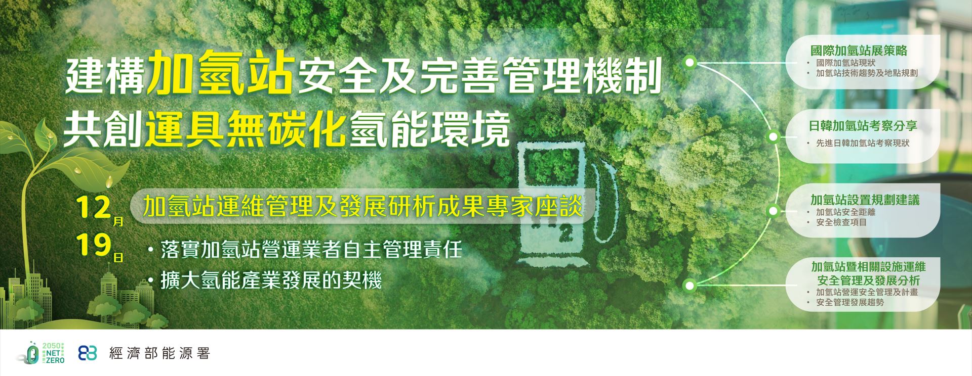 為建構設置加氫站之安全環境及完善管理機制,共創運具無碳化友善氫能環境,經濟部能源署委託財團法人工業技術研究院,研析加氫站運維管理及發展,於112年12月19日(星期二)舉辦研析成果專家座談,會議包含四大主題:「國際加氫站發展策略」、「日韓加氫站考察分享」、「加氫站設置規劃建議」、「加氫站暨相關設施運維安全管理及發展分析」。在「國際加氫站發展策略」中將提供國際加氫站現況、加氫站技術趨勢等,在「日韓加氫站考察分享」,將分享實際考察日韓加氫站案例,在「加氫站設置規劃建議」中將配合已公告「加氫站銷售氫燃料經營許可管理辦法」,提供安全距離及安全規定、空間配置等詳細說明,在「加氫站暨相關設施運維安全管理及發展分析」中將提供加氫站相關營運安全管理及發展趨勢等。透過各種面向,深度探討加氫站現況、設置規劃及安全管理的各個內容。