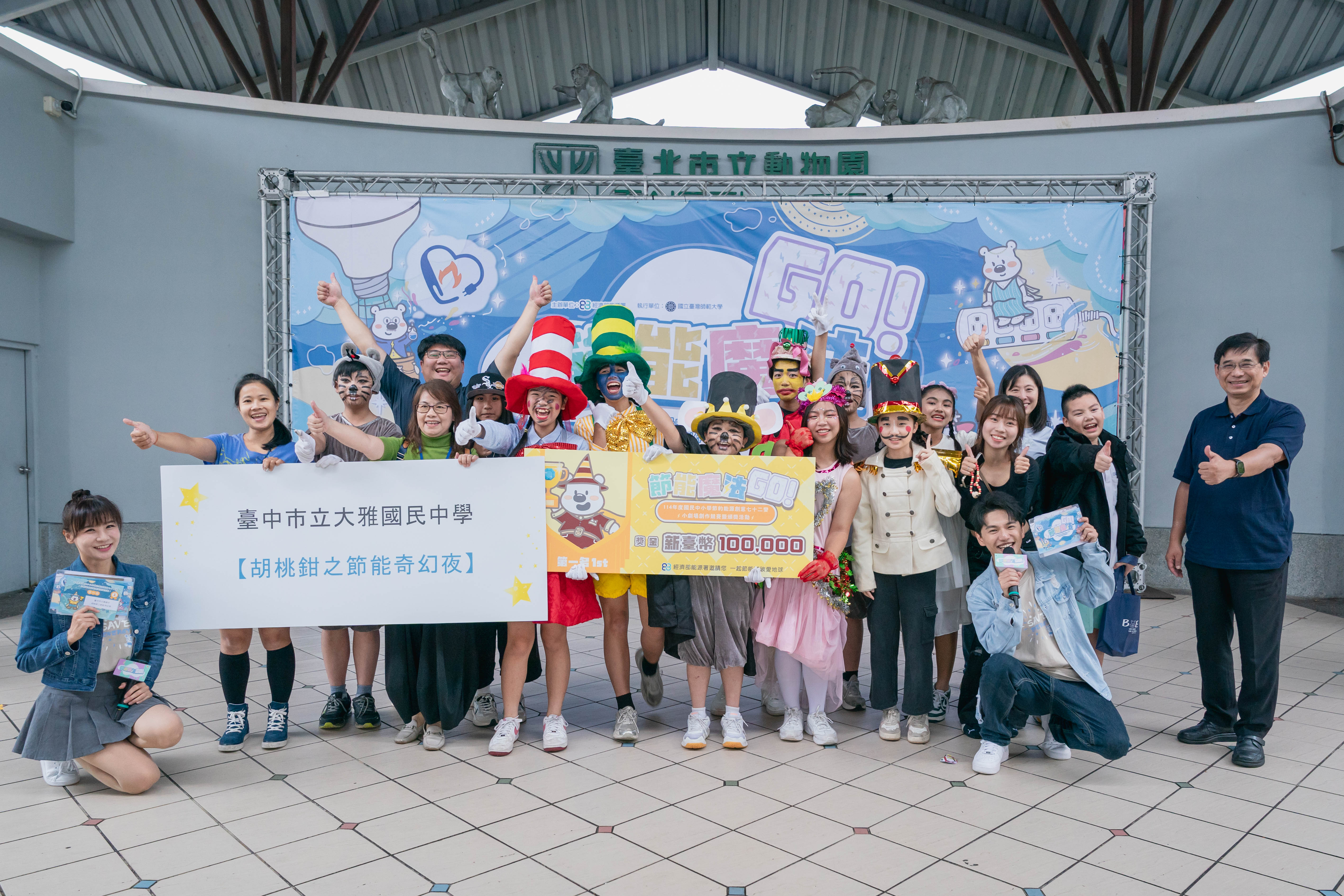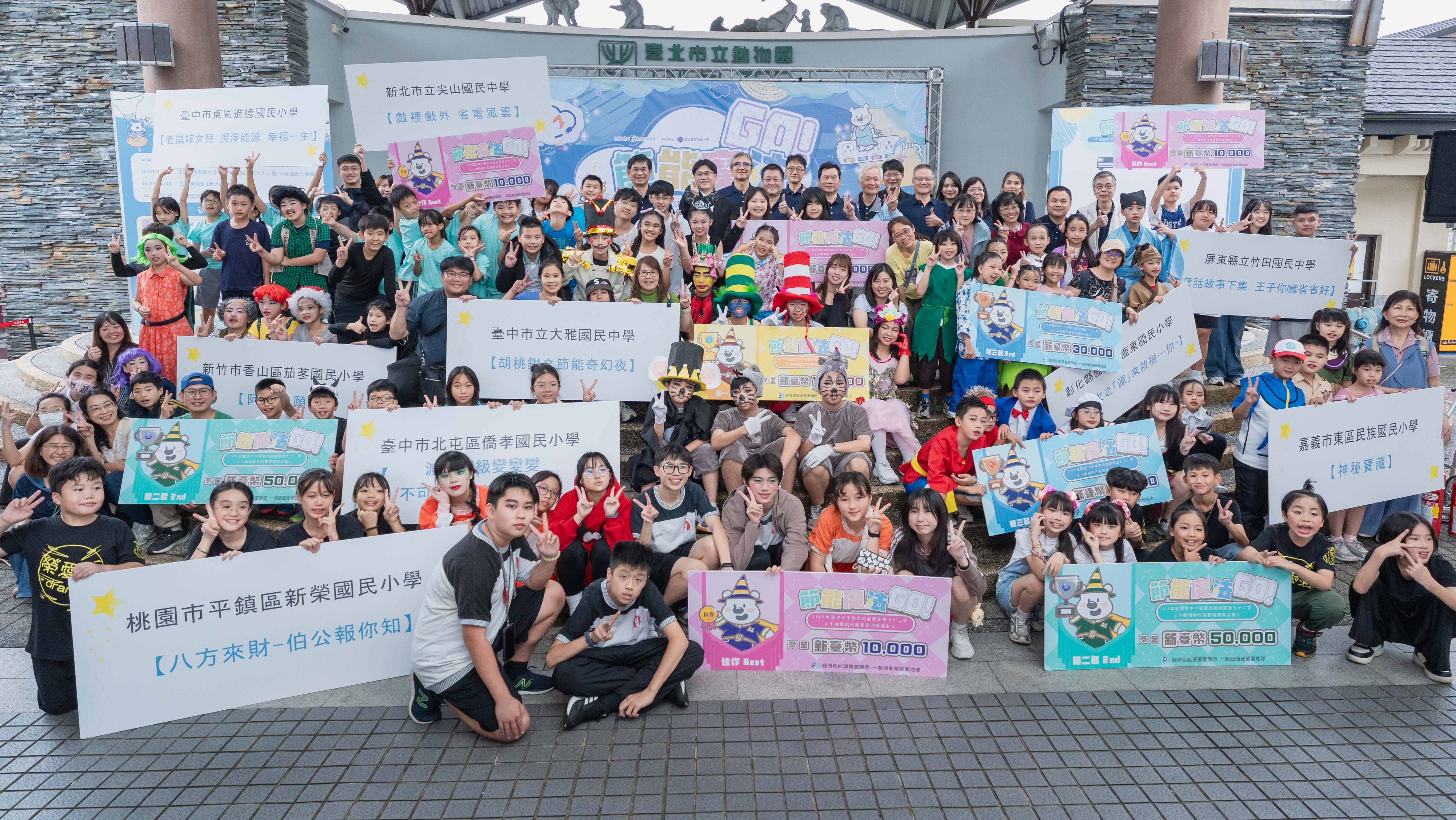 經濟部能源署11月1日於臺北市立動物園舉辦年度盛會「114年度國民中小學節約能源創意七十二變-小劇場創作競賽暨頒獎活動」圓滿落幕!活動結合省電魔法創意、能源教育戲劇與親子同樂攤位,全國中小學熱情報名參與,由10隊決賽隊伍在舞台展現極具創意的節能觀點及精心排練的精彩演出,精彩舞台演出讓現場觀眾大飽眼福,最終由臺中市立大雅國民中學勇奪戲劇競賽第1名,能源署期盼藉此活動向更多民眾傳遞節能知識,共同邁向2050淨零之路!