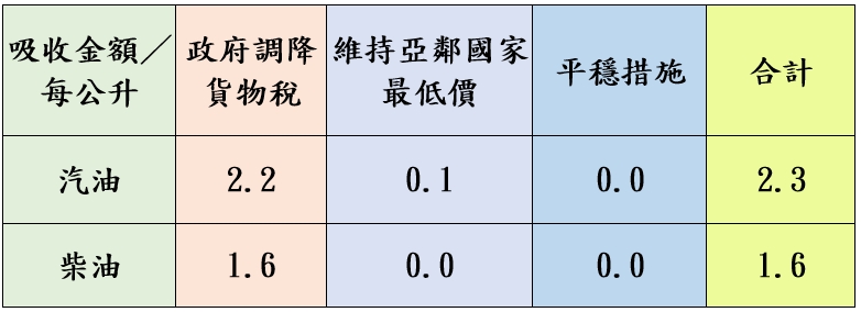 按浮動油價機制調整原則,汽油每公升應調降0.1元、柴油價格應不調整,惟為維持價格低於亞洲鄰近國家(日、韓、港、星),汽油吸收0.1元。吸收金額如下表: