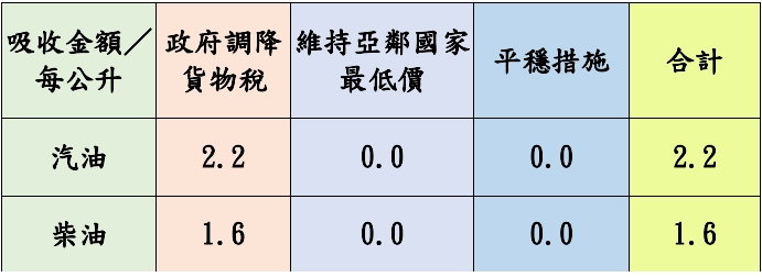 按浮動油價機制調整原則,汽、柴油價格每公升應各調降0.4元,已低於亞洲鄰近國家(日、韓、港、星)。吸收金額如附表。