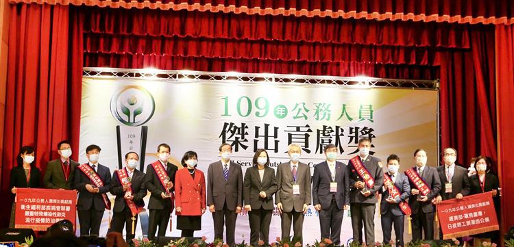 新冠肺炎本(109)年初衝擊全球,國內口罩需求激增,經濟部用熱情對抗疫情,以公私合作夥伴模式,規劃緊急創新採購機制,積極協調國內業者日夜趕工擴建產線,並推動成立原料統一調度平台,使國內醫用口罩產量3個月內提升10倍,不僅滿足國內醫療院所與民眾需求,成功防堵國內疫情,4月初更有餘裕援助他國,展現國際互助精神,讓世界看見臺灣產能實力,創造國家經濟額外效益,前瞻思維與創新作法受高度肯定,今(15)日獲本(109)年度「公務人員傑出貢獻獎」團體獎殊榮,由蔡英文總統親自頒發獎座,林全能次長代表受獎。