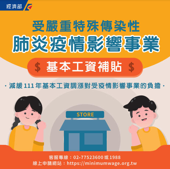 經濟部今天(1/14)公告受疫情影響事業基本工資補貼將自111年1月17日(一)上午8時起開放網路申請(網址https://minimumwage.org.tw/)。