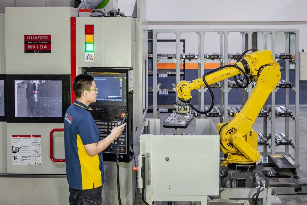 在中小企業組獲得金獎的鼎霖國際,是全球知名越野車品牌的零配件研發商,透過智慧倉儲管理,優化製程動線並精準控制加工排程,減少待機與人為錯誤。同時導入數位電表與能源監控平台,將節能管理由「人工經驗」提升至「科學數據」掌控。為實現無人作業之「關燈工廠」目標,以機械手臂執行搬運與運送作業,打造無需人力與照明的節能生產模式,展現中小企業在節能方面的卓越實踐。