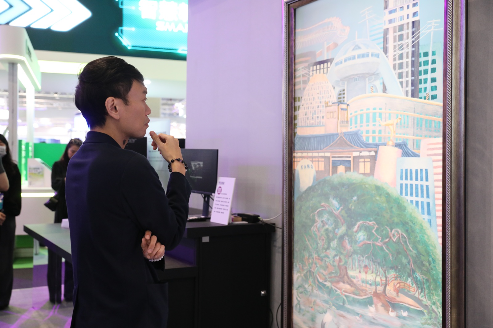 工研院展出的「8K影音互動生成」則是攜手國立故宮博物院打造「AI藝廊–城市畫卷」,結合AI動態生成與超擬真顯示技術,可依據畫家風格與題材生成流暢自然的動畫場景,突破傳統動畫難以呈現藝術筆觸的限制,進一步重新詮釋城市風貌與文化精神,打造融合科技與藝術的沉浸式互動體驗。展件將傅狷夫、陳澄波、郭雪湖等藝術家經典畫作轉化為沉浸式動態影像,並巧妙融入台北101、煙火與晶圓廠等現代城市意象,使百年經典作品以AI之筆再現風華。