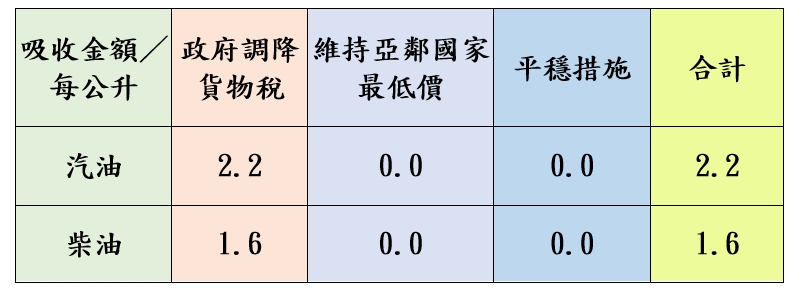 本週依油價公式及政府調降貨物稅(汽、柴油每公升各共2元及1.5元)調整國內油價,並持續以亞鄰國家最低價及平穩措施運作,協助穩定國內油價,114年累計至11月底止,台灣中油共吸收約64.44億元。調價後各式油品參考零售價格調幅及調整金額如附表,實際零售價格以各營業點公告為準。(亞鄰油價資訊請參考全球資訊網https://www.cpc.com.tw產品與服務--產品價格與資訊--亞鄰各國比較表)